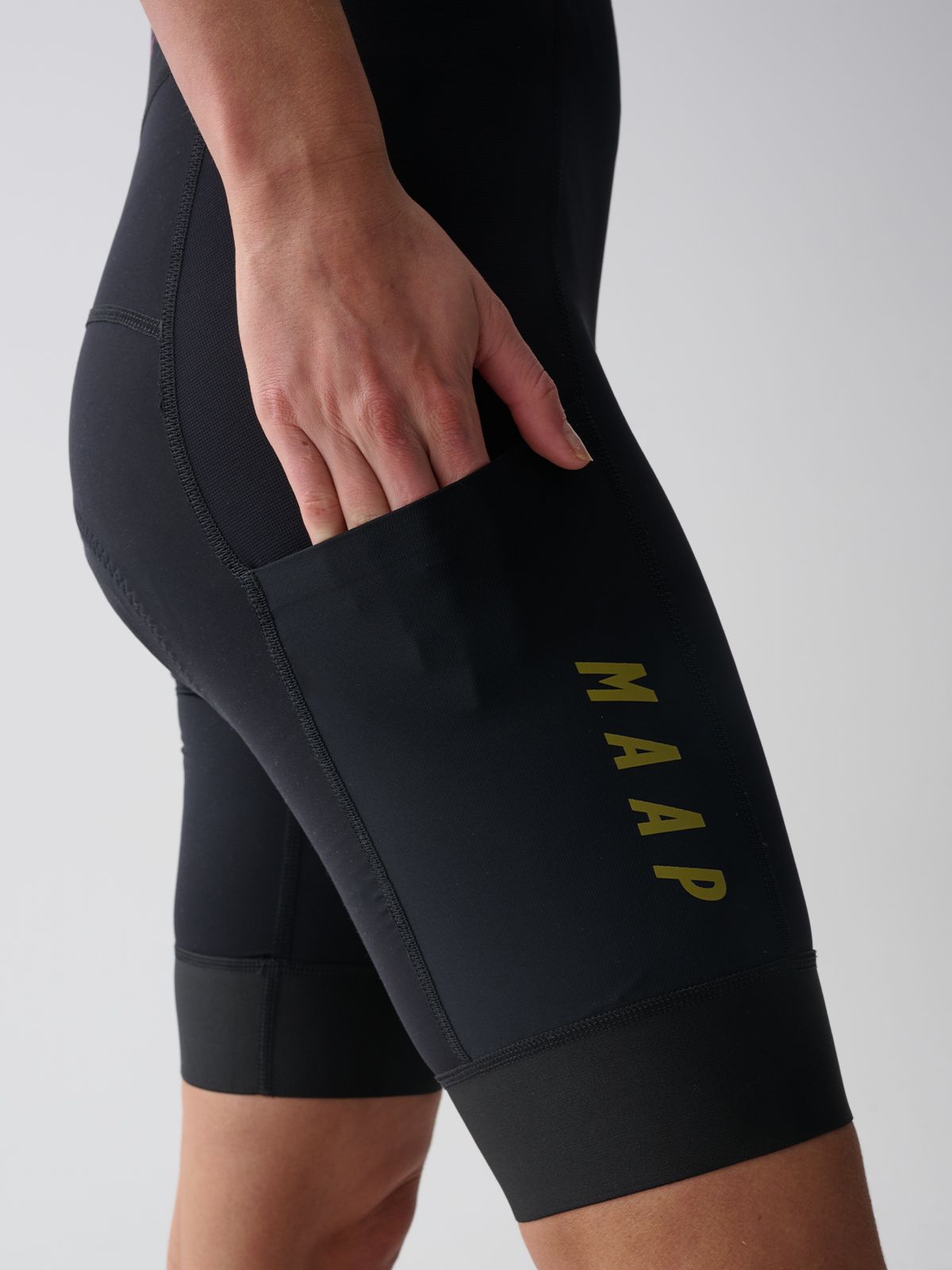 Head off-grid with the Women's Alt_Road Cargo Bib Shorts. A highly technical bib short that combines lightweight, 4-way stretch compressive material for ultimate comfort alongside highly durable qualities that will go the distance. Constructed with MAAP's proprietary women's specific 3D thermo moulded, 3-layer chamois, featuring lazer cut perforations for breathability and an antimicrobial liner for all-day riding comfort. Abrasion-resistant side leg panels provide added protection for rugged riding, while internal seams are flatlock stitched to eliminate skin abrasion. Engineered with long adventures in mind, the Women's Alt_Road Cargo Bib Shorts have an open cargo pocket on one side that easily fits a phone and a zippered pocket on the other side for securing valuables. In addition, the bib and brace feature dual rear pockets designed for storing snacks alongside high airflow mesh for breathability and comfort. Moisture-wicking, quick-drying and anti-odour properties combined with UPF 50+ protection and reflective external branding make the Women's Alt_Road Cargo Bibs perfect for wherever and whatever the ride.